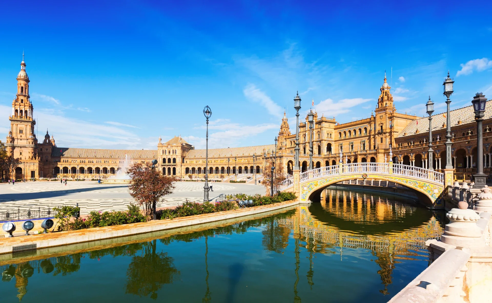 HISTORIC SPOT Walk through Seville’s picturesque Plaza de España, originally built for Seville's Ibero-American Expo at the 1929 World's Fair, the 540,000-square-foot plaza features a sprawling mosaic patio. Explore the historic Santa Cruz quarter and its magical maze of tapas, flamenco, and cafés